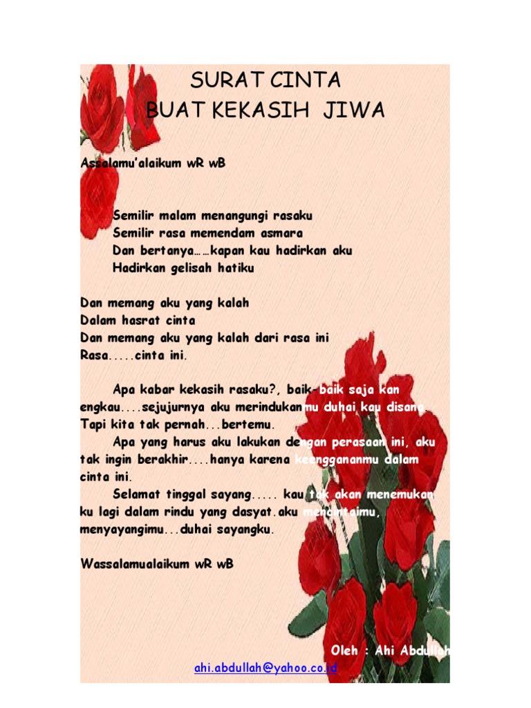 Surat Cinta Rindu Untuk Sang Pacar Kumpulan Contoh Surat Proposal Laporan from 1.bp.blogspot.com Dan karena hal tersebut jugalah makanya kami berniat memberikan artikel ini untuk anda sekalian. Contoh surat cinta untuk pacar/kekasih. Apakah surat cinta untuk pacar anda sudah memiliki pacar? May 18, 2019 · quotes romantis buat pacar tersayang.quotes baper penuh kata romantis mutiara dan di tulis dengan kata kata yang bikin baper cewek maupuncowok tersayang dengan singkat serta dapat menyentuh hati buat status di facebook fb instagram ig instastory whatsapp wa storywa dan sosial media lainnya untuk media pengungkapan hati kepada pacar agar ia luluh. Feb 15, 2021 · secara umum puisi cinta romantis untuk pacar tersayang tersebut bercerita tentang seseorang yang ingin mencintai pujaan hatinya dengan sederhana dan tanpa pamrih meski penuh pengorbanan. Bagaimana anda membuat surat cinta romantis untuk pacar tercinta? Contoh surat cinta buat pacar wanita. Apa yang bisa ditulis surat cinta untuk pacar?